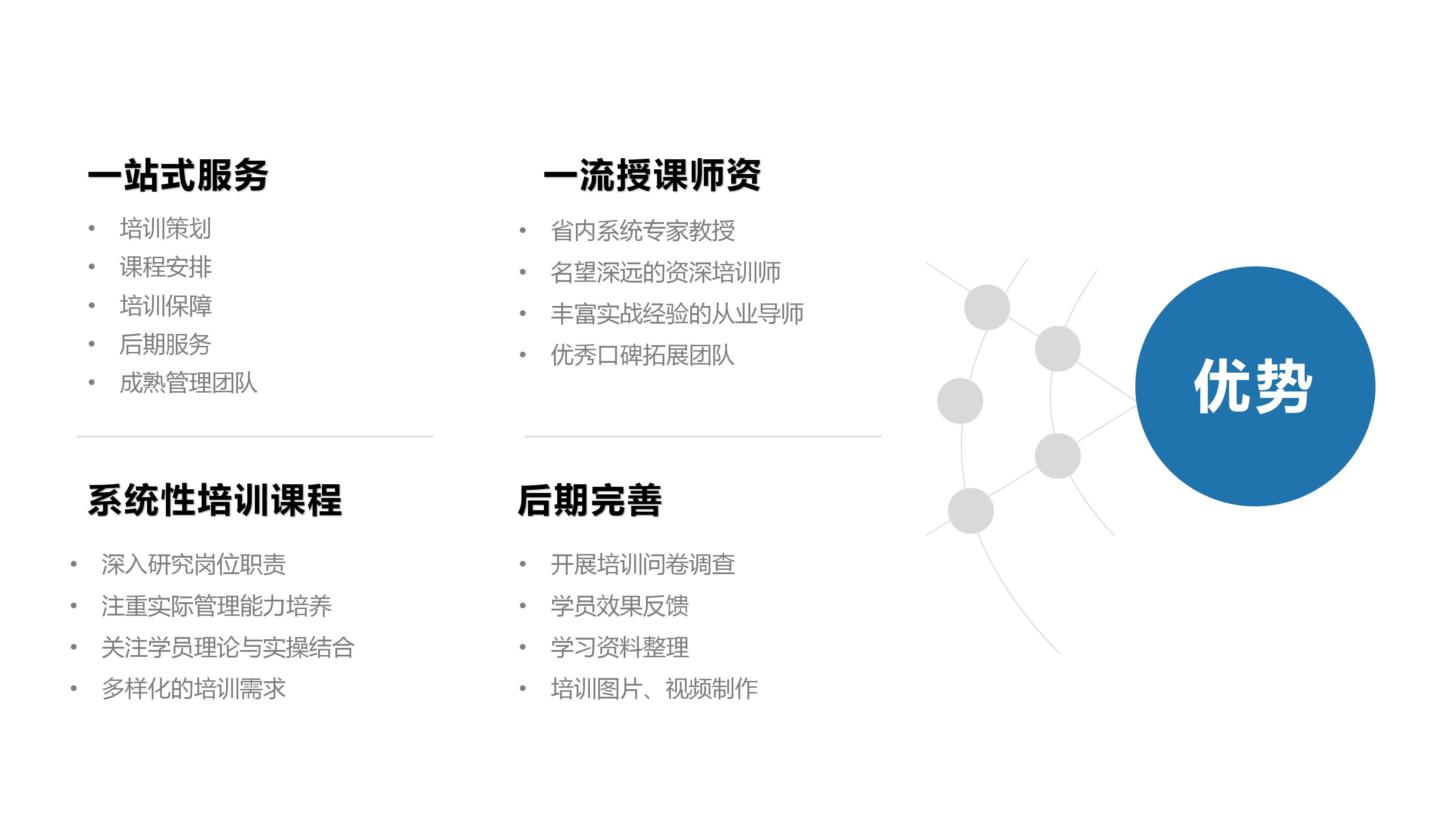 培訓(xùn)服務(wù)項(xiàng)目從制訂培訓(xùn)方案、提供會(huì)場(chǎng)服務(wù)、個(gè)性化課程設(shè)計(jì)、培訓(xùn)期間交通餐飲住宿整體服務(wù)、學(xué)員觀摩參觀、學(xué)員反饋、命題測(cè)試等方面不斷延伸。